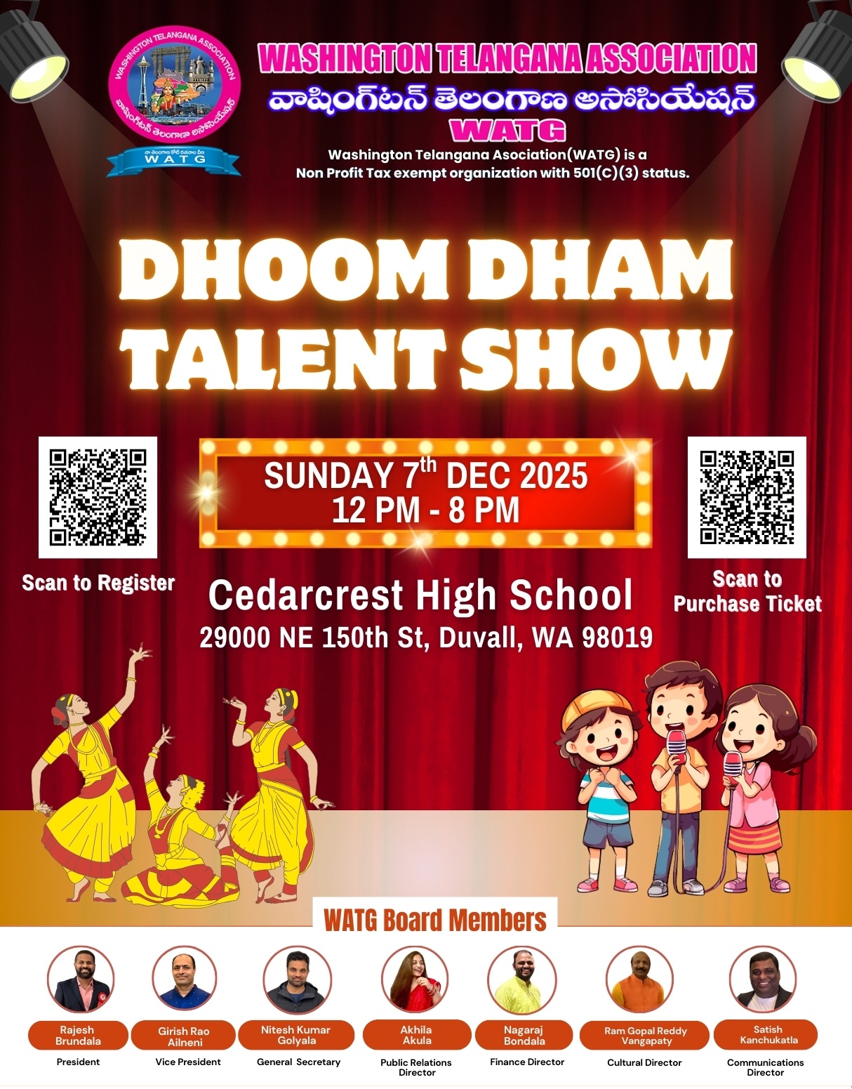 Washington State Telangana Association (WATG) is a non-profit organization formed by Washington State area Telanganites to promote Telangana culture and identity, and contribute towards development of Telangana. WATG is formed to provide a platform for cultural, educational, social and development activities in Washington State and in Telangana region. WATG conducts several events and charity fund raising programs every year.